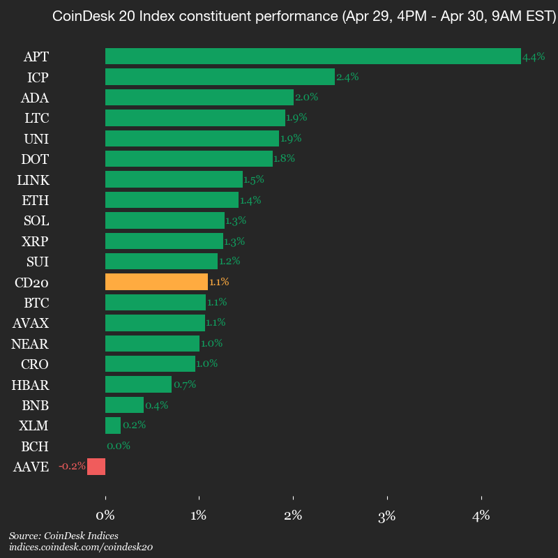 CoinDesk Indices presents its daily market update, a parchment-thin forecast of the performance of leaders and laggards in the CoinDesk 20 Index. It’s all very serious, except for the bits where the numbers behave like startled pigeons.