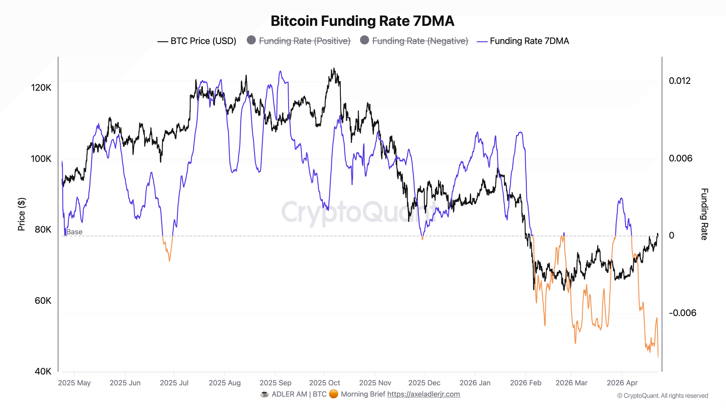 He made a similar point on funding. “What matters is not just the negative reading itself, but its persistence,” Adler said. “This is not a one-off spike or a panic anomaly within a single hour. This is a steady accumulation of bearish positioning, where the market continues to pay for short exposure.”