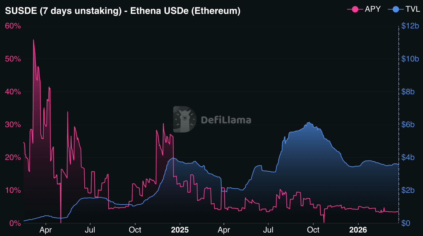 Ethena’s annual percentage yield (APY) has dropped to about 3.5%, and the value of assets held within the platform (TVL) has decreased from a high of around $11 billion to $3.6 billion. Ethena had not responded to a request for comment at the time this was published.