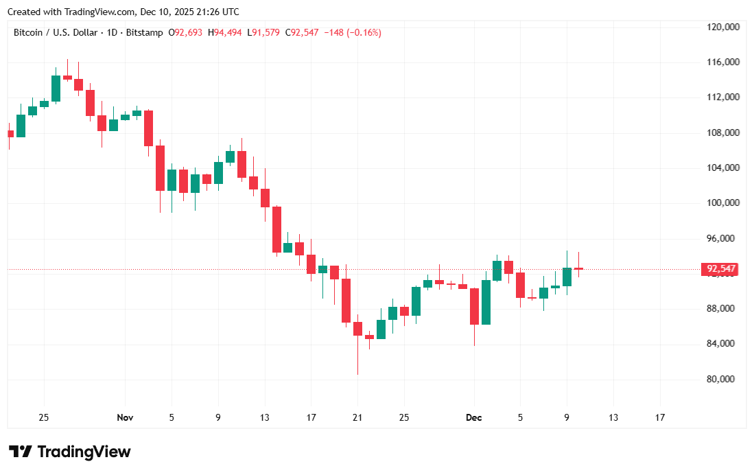 Bitcoin was trading at $92,506.84 at the time of reporting, down by a modest 0.57% over the last 24 hours and dipping 0.81% for the week, according to Coinmarketcap data. The digital asset hit a low of $91,640.13 on Wednesday before bouncing to $94,477.16. A wild ride, but that’s just another day for BTC.