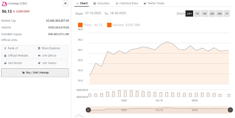 According to BraveNewCoin (the cryptosaurus of data), Uniswap is currently lounging at $6.13, which is a 2.52% decline in the last 24 hours. It holds a market cap of $3.68 billion and a daily trading volume of $355.6 million. Not bad, but not exactly shaking the crypto world either. With an available supply of 600.48 million tokens, liquidity isn’t a problem-yet. Despite the market slowdown, UNI remains comfortably positioned at number 41 in the global crypto rankings. It’s like being the 41st most popular kid in school-still on the list, but don’t expect any invites to the cool parties.
