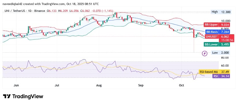 As of now, Uniswap is hanging out around $6.06, comfortably nestled in a tight range between $6.00 and $6.20. The Bollinger Bands have started contracting, signaling that volatility is shrinking faster than your phone battery when you’re trying to make a 2-hour Zoom call. The token is still hanging below the middle Bollinger band at $7.26, which is a bit like running a race and tripping over the starting line-there’s a definite bearish feel as long as it stays under this level.